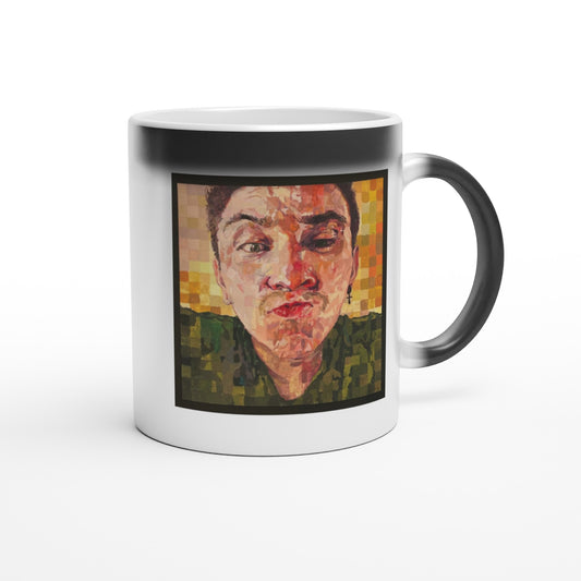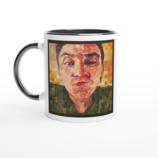 "Richi" is a whimsical pop art portrait showcasing a playful facial expression. Created with the grid technique, it features a vibrant mix of oranges, pinks, reds, and purples for shadows. The bold colors and gouache medium highlight the silly, exaggerated features, making the piece visually striking and fun.