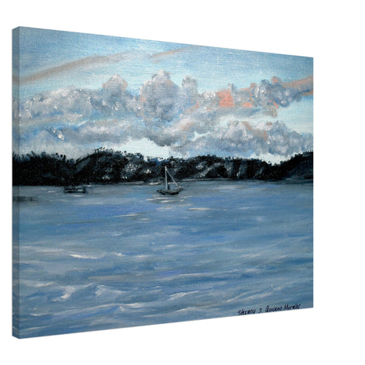 "Samaná" is a breathtaking oil on canvas landscape painting inspired by a trip to the Dominican Republic. The artwork captures the serene beauty of Samaná with its different tones of blues, from the tranquil sea to the expansive sky. Rich volumes in the clouds create a dynamic and immersive atmosphere. The use of darker and more muted colors for the distant town of Samaná on the horizon adds a sense of depth and realism, inviting viewers to feel as if they are truly there. This piece encapsulates the essence of the coastal paradise, blending vivid natural beauty with a peaceful, inviting presence.