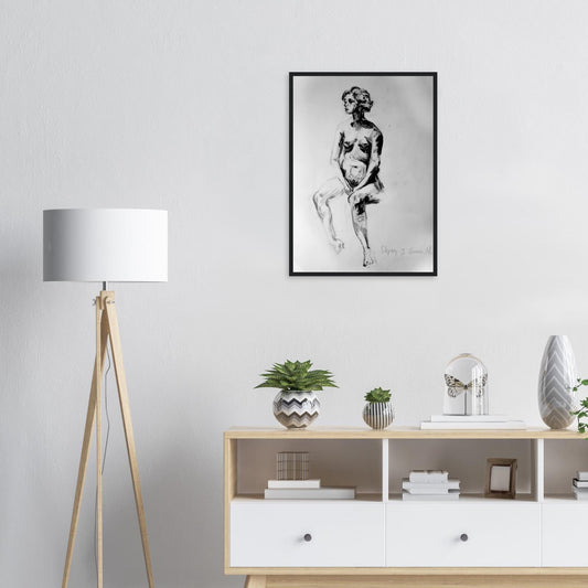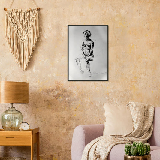 This captivating charcoal drawing on paper features a woman sitting gracefully. Utilizing the chiaroscuro technique, the artist masterfully plays with light and shadow, bringing out the expressive depth of her eyes. The delicate curves and natural folds of her skin are meticulously rendered, enhancing her feminine beauty and adding a sense of realism. The piece exudes an emotive and timeless quality, celebrating the elegance and allure of the female form.