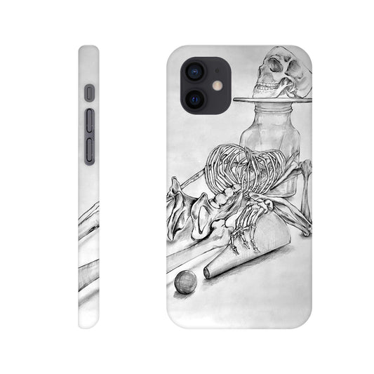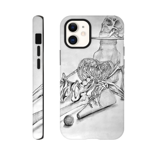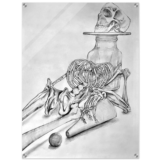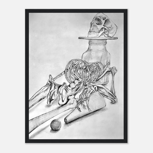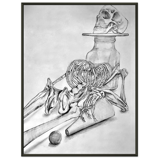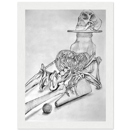 This captivating graphite drawing on paper, titled "Still Death," features a meticulously rendered skeleton in a still life composition. Using a range of graphite tones, from soft grays to deep blacks, the artist expertly plays with highlights and shadows to create a sense of volume and texture. The precise details of the rib cage, skull, and bones are skillfully emphasized, adding a layer of realism while maintaining an air of quiet contemplation. The delicate balance of light and dark evokes a somber yet reflective mood, inviting the viewer to contemplate the passage of time.