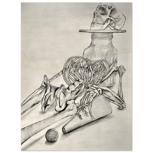 This captivating graphite drawing on paper, titled "Still Death," features a meticulously rendered skeleton in a still life composition. Using a range of graphite tones, from soft grays to deep blacks, the artist expertly plays with highlights and shadows to create a sense of volume and texture. The precise details of the rib cage, skull, and bones are skillfully emphasized, adding a layer of realism while maintaining an air of quiet contemplation. The delicate balance of light and dark evokes a somber yet reflective mood, inviting the viewer to contemplate the passage of time.